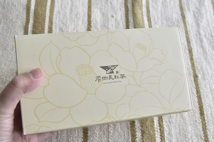 米白色的印盒 在印上廖鄉長紅茶故事館的紅磚色logo