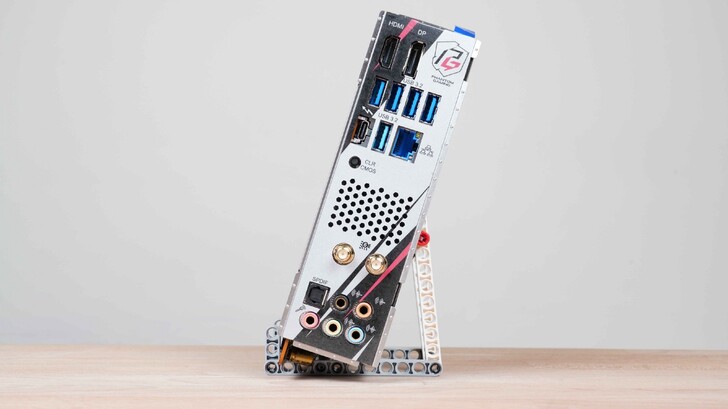 背面 I/O 部分採用一體式檔板,接頭種類非常豐富,像是視訊接頭就給了 HDMI 和 DP,其他還有一個 TB4 接頭。特別的是 CLR CMOS 也放到這邊,超頻失敗後想要重設 BIOS 也不用拆機殼。