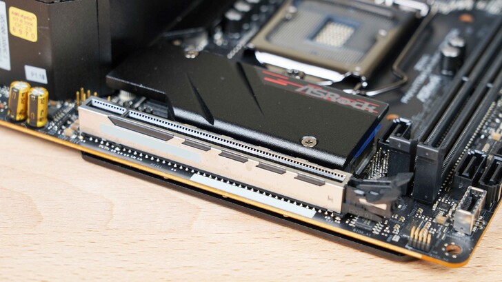 印有 ASRock 圖案的散熱片下方是 M.2 PCIe 插槽,支援 PCIe 4.0 。通常選這個等級的主機板的人,顯卡應該都部會用太差。由於插槽有金屬外殼強化,不太需要擔心用大張顯卡時插槽斷裂的問題。