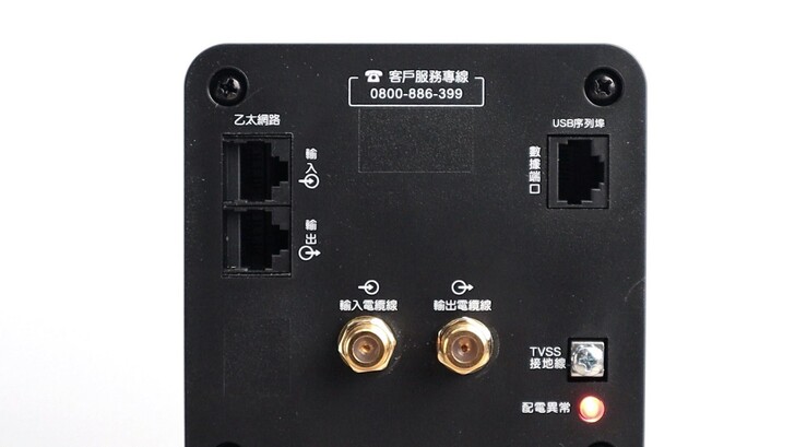 上方還有針對乙太網路和同軸電纜的突波保護。如果是兩孔的插座,或是配電有異常,機器上背面的「配電異常」指示燈就會亮起。可以使用導線將上方「TVSS 接地線」連接至地線。
