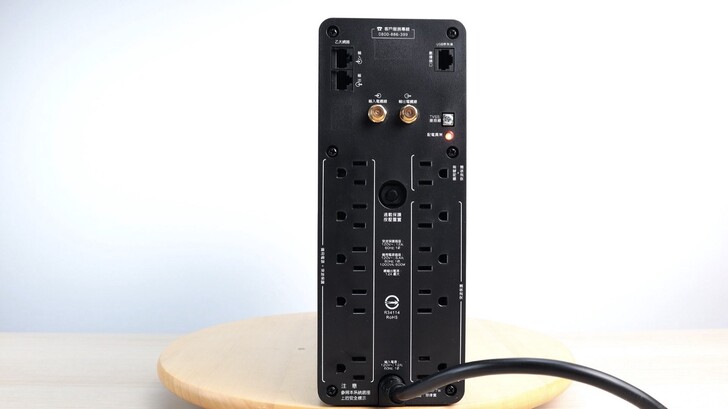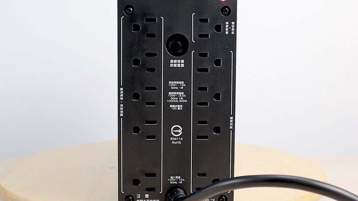 後方插座部分排列與上一代非常相似,幾乎沒有學習成本。左邊五個和右邊上方一個,共有六個插座具有「備用電源」和「突波保護」的功能。右邊四個插座則只有「突波保護」功能的插座。