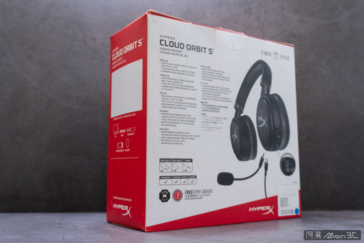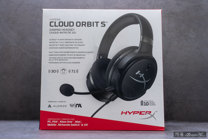 HyperX Cloud Orbit S 是一款主打立體音場的高階耳機,為 HyperX 品牌中最頂級的款式。從外包裝正面可看到 HyperX Orbit S 主打的特色:3D、7.1 聲道、Audeze、Waves Nx 頭部追蹤技術。