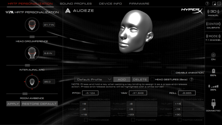 那你現在看到有這個銀色人頭的軟體就是 HyperX 與 Audeze 合作的軟體。這顆銀色的頭會隨著你同步真實的轉動去變化,那左側的面板上有一些可以調整的數據。這部分就要將先前提到的紙尺派上用場,用來量頭圍等參數。