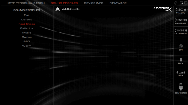 在 Sound profile 這個面板,則可以調整模式,例如腳步聲模式、賽車模式、音樂模式等。而右邊的面板則是顯示耳機的狀態,3D 可以調整為 AUTO / On / Off / Manual;Mode 可以調整為雙聲道 / 7.1 聲道 / Hi-Res。
