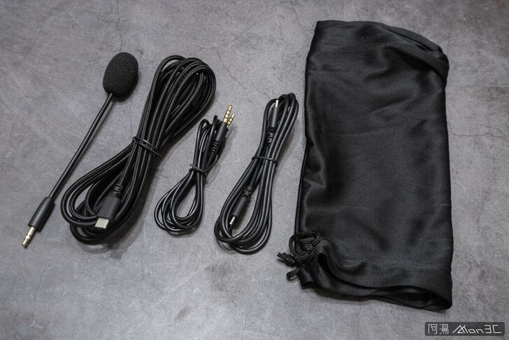 配件盒內附有 (由左至右) 麥克風、USB-A to USB-C 編織線、3.5mm 音源線、USB-C to USB-C 線材、束口袋。