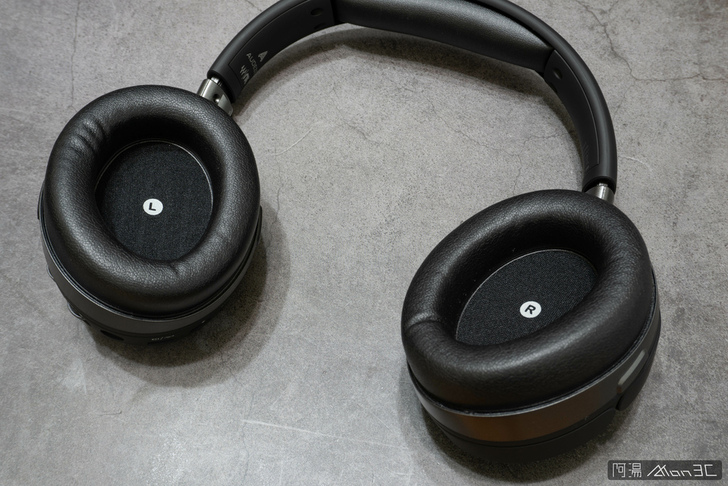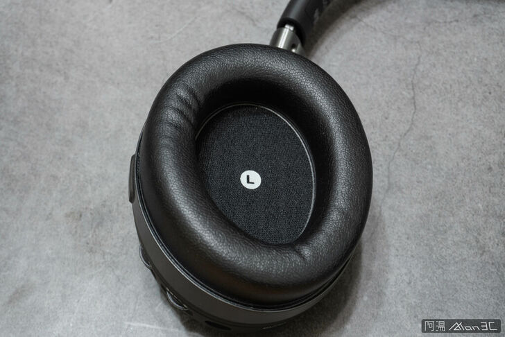 耳罩為皮革材質,裡面塞滿記憶海綿,十分鬆軟,裡面的布料上有印著 L / R 對應到耳機的左聲道與右聲道。