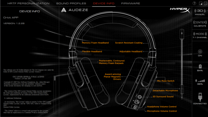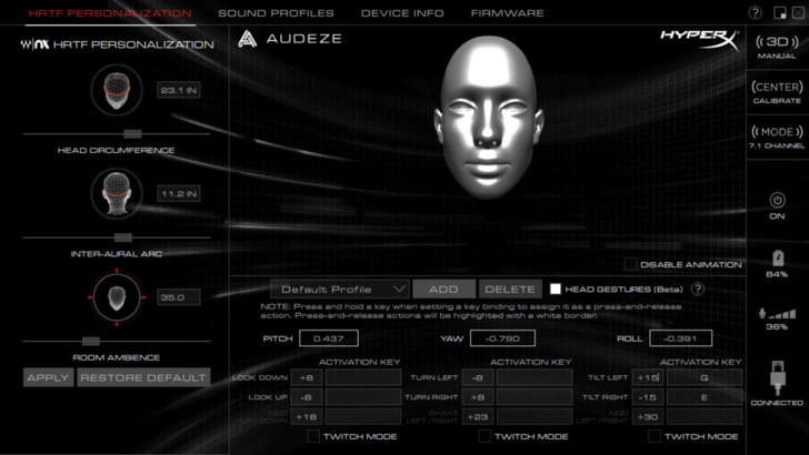 HyperX Orbit S 這款耳機很特別,不是瞎掰的特別,是真的很獨特。前面提到 HyperX Orbit S 支援一個叫做頭部追蹤技術的東東,而這東西很變態。當你戴上耳機,並且調整模式到 7.1 聲道 + 3D 模式。然後放音樂,此時你頂多覺得,哦~ 這款耳機音效還不錯嘛。但當你轉頭,你會發現,聲音竟然移動到了側邊。就像是你真的在你的電腦前設了一個 7.1 聲道的音響系統,會隨著你頭面向的方位去改變聲音的來源。