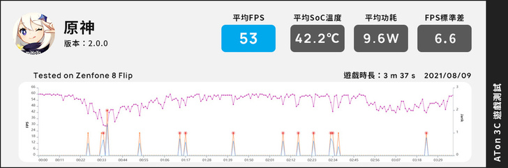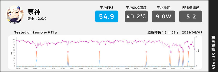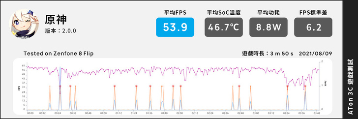 可看到原神這類高附載的遊戲對於現在的手機還是有點難以負荷的,在特效全開的情況下,把 S888 操到平均溫度達到 46.7℃。此時可看到幀曲線圖已經出現了許多向上突出紅色的卡頓點,此時 Zenfone 8 Flip 以達到全機都很燙的地步,但這邊強調一下,全機都很燙代表散熱有做好,如果只燙 SoC 的區域才是散熱沒做好。可見儘管手機本身散熱並不差,但 S888 的熱度已經讓整支手機燙到有點干擾遊戲體驗了。