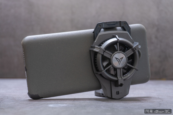 側面就可看到周圍的散熱片,用來將製冷晶片的熱散出。底下可看到特殊造型的手機夾。