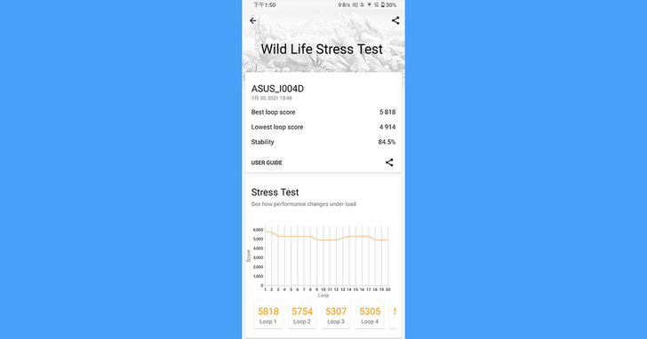 另外我也試著跑 3DMark Wildlife Stress Test,在裝著蜂翼 2 Pro 的情形下,跑出了 84.5% 的穩定度。相較於沒裝蜂翼 2 Pro 的 59.6% 穩定度,差距挺大。