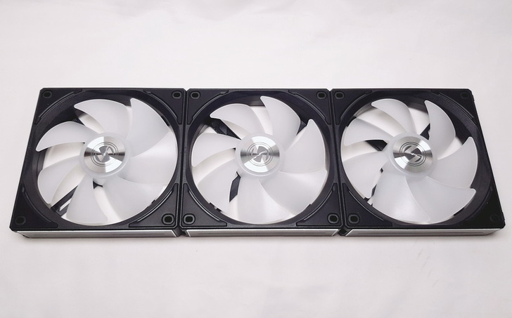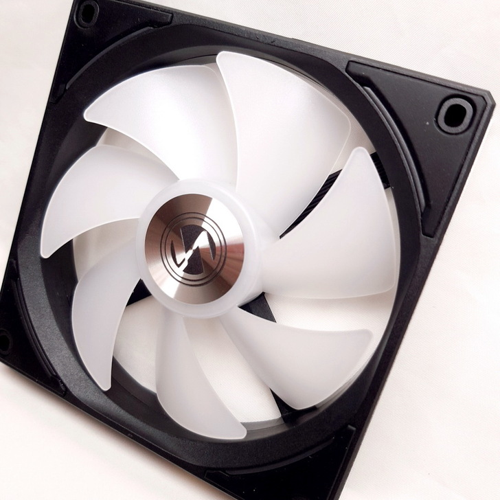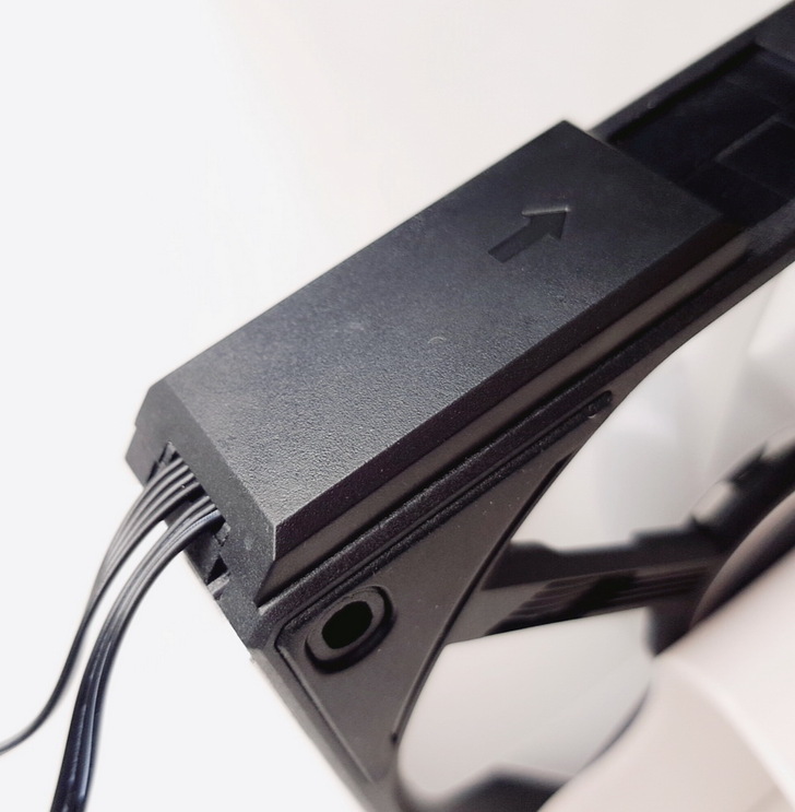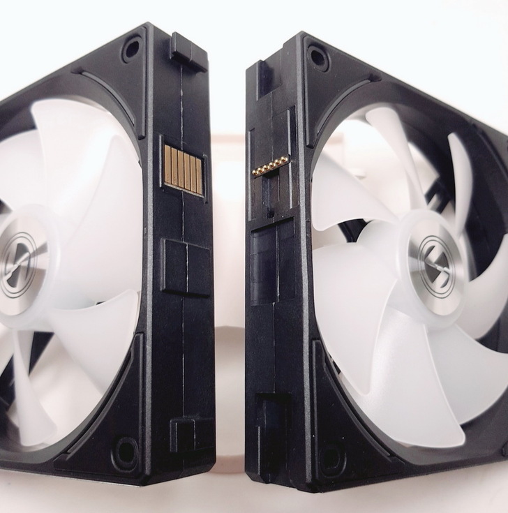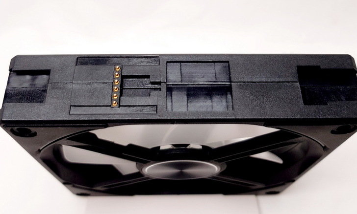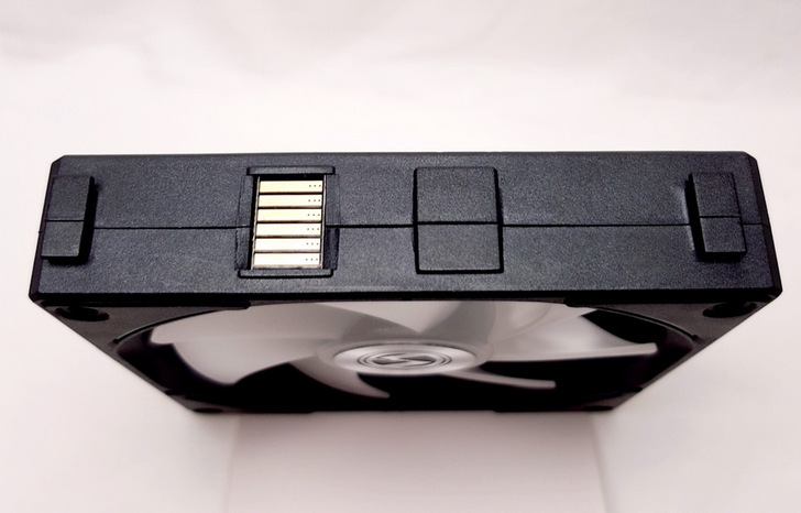 ▼ UNI FAN AL120 最厲害的是完全看不到突出的線材,只會在 風扇上方看到金屬接觸面、風扇下方看到金屬接點。