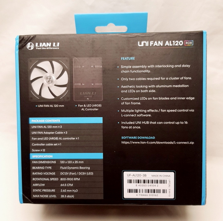 這次要開箱的是 UNI FAN AL120 三顆風扇(黑)包裝,尺寸為120mm、最大噪音為28.3dB、轉速為800~1900RPM、最大風量64.5CFM、邊框四周有減震橡膠墊。