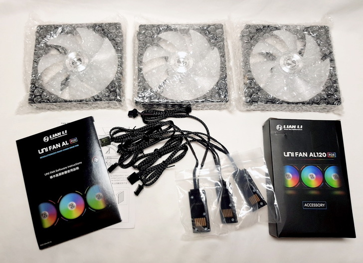 ▼ 盒裝內容物:UNI FAN AL120*3、產品安裝指南、軟體說明書、風扇訊號連接線*3、ARGB控制器配件盒。