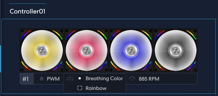 ▼ 一個ARGB控制器可以控制四組風扇,下方中間可以分別調整 扇框及扇葉 燈效模式,右邊可以自訂顏色及燈效轉換的速度及燈光的強弱。