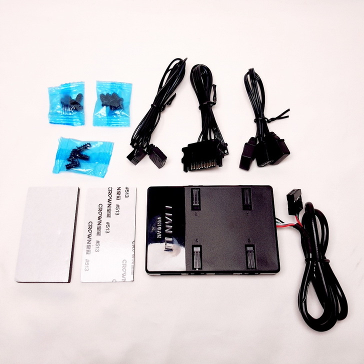 ▼ ARGB控制器配件盒:固定螺絲三組、控制器USB連接線、控制器電源線、ARGB主機板連接線、磁吸貼片、魔鬼氈貼片、ARGB控制器。