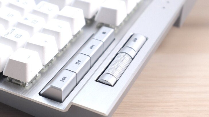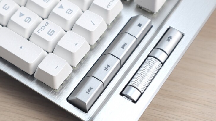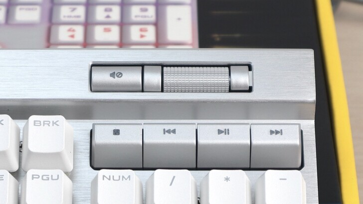 滾輪沒有段落感也不能按壓,就像 K100 的音量滾輪一樣,非常好滑,控制音量也相當精準。雖然是塑膠材質,但是表面仿金屬壓花的手感讓操作感受非常棒。