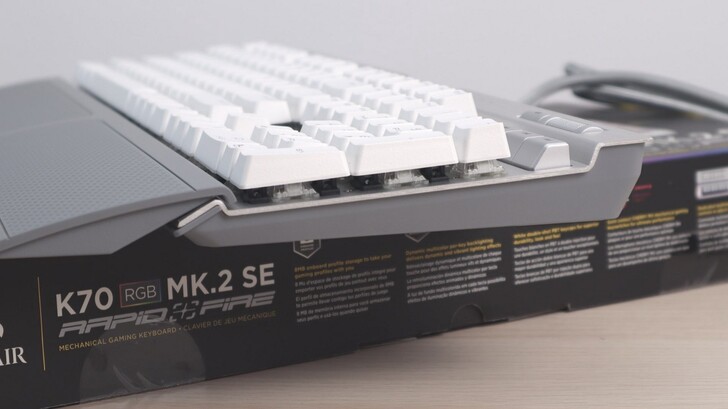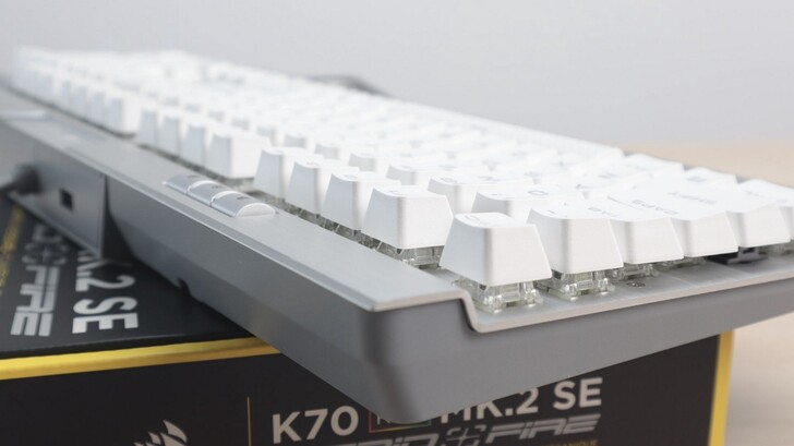 K70 RGB MK.2 SE 軸體為 Cherry MX 銀軸,配上銀色機身。原本想找的 K70 LUX 則是紅軸,配的則是黑色金屬機身。論機身顏色的話,我更青睞銀色的款式,不過鍵盤的主人倒是覺得都 OK。