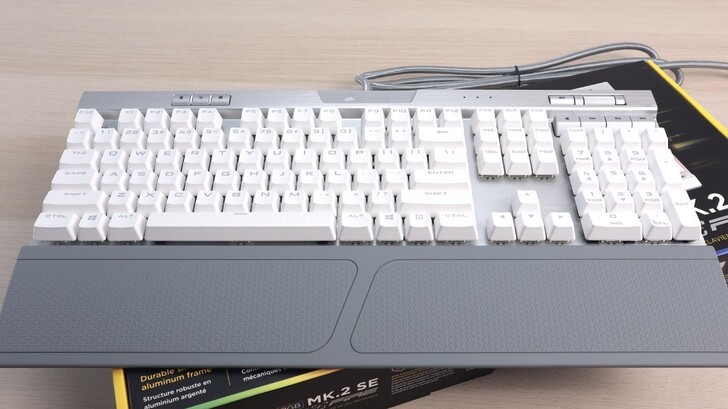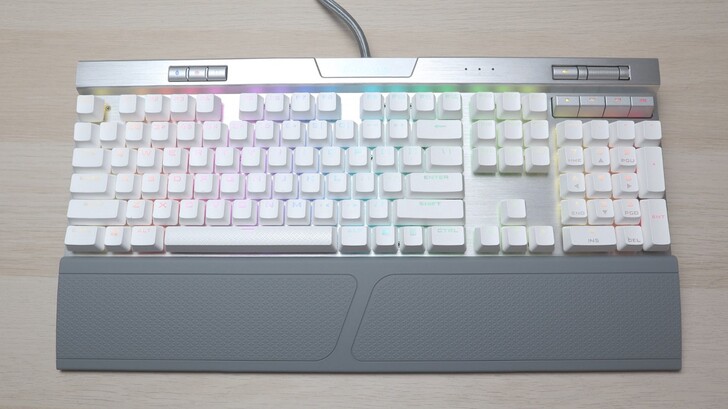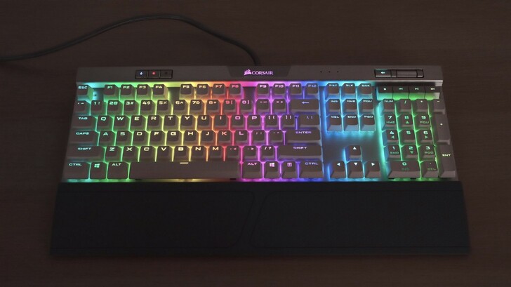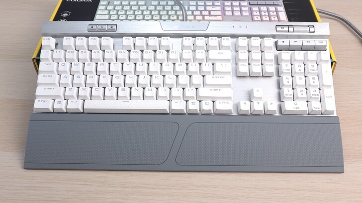 銀軸的打感不錯,既有段落感,聲音又比較安靜。K70 RGB MK.2 總共有兩款,銀軸款的外觀是白色鍵帽和銀色機身。K70 青軸款,則是黑色鍵帽配上黑色機身。鍵盤包裝內也包含了手拖,比較了一下材質與 K100 有些許不同,也沒有 K100 的磁吸設計。但這個手拖也不錯,表面摩擦力夠,又不會太硬,表面也好保養。