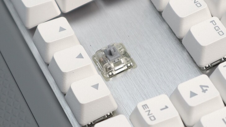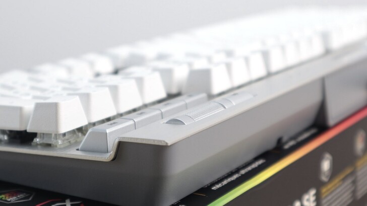 白色鍵帽是採用 PBT 雙色注塑成型,因此不會有鍵帽印刷掉色的問題。鍵程標示為 1.2mm。內建有一顆 32bit ARM Cortex 處理器,並具備 8MB 的記憶體,可以儲存三組 Profile。