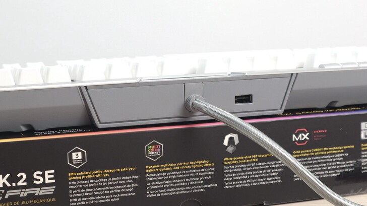 鍵盤的 USB 線比一般還粗許多,為不可分開的設計。表面還有銀色的編織線,不僅降低了打結機會,質感也提升不少。而線身比較粗,是因為裡面其實是兩條 USB2.0,一條獨立給鍵盤,一條則給畫面中線旁的 USB 接孔。獨立的 USB 可以額外再接滑鼠或耳機。