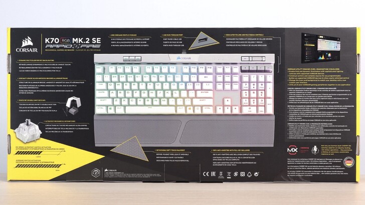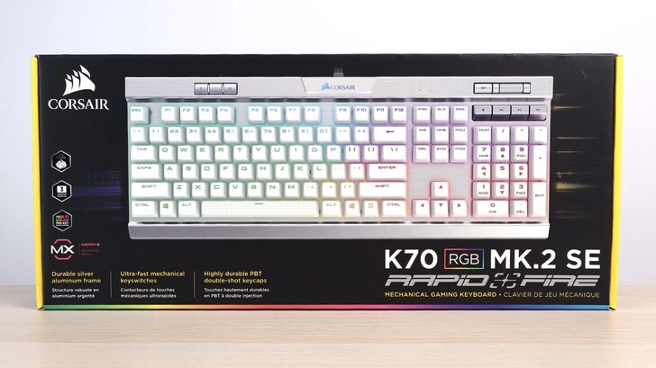 包裝正面是產品大大的圖片,還有黑色為底、黃色點綴,經典的海盜船包裝配色。型號是 K70 RGB MK.2 SE,官方定價是 $5,290 元,不過實際上 4 字頭就可以購得。
