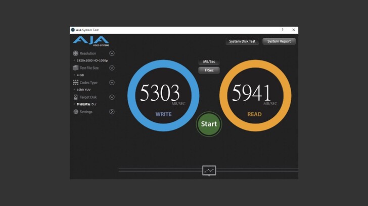 在 AJA System Test 中以 4GB 檔案進行測試,寫入約 5300MB/s,讀取約 6000MB/s。