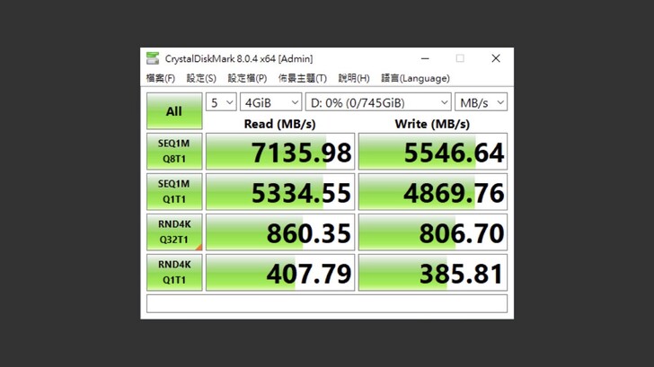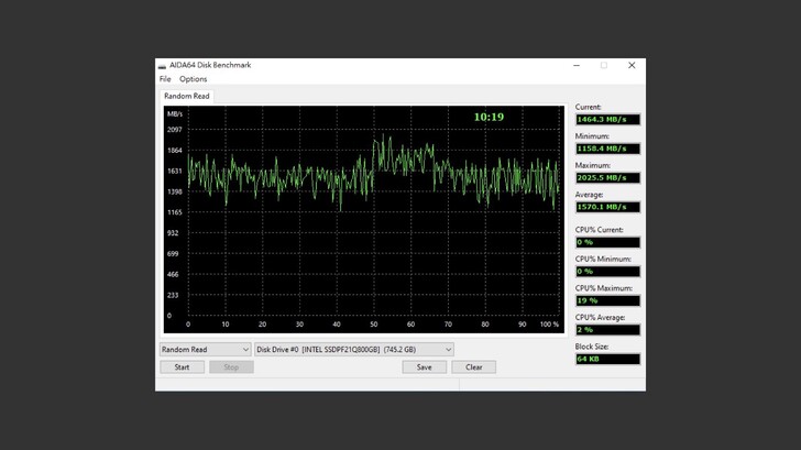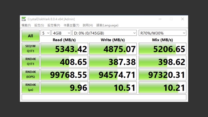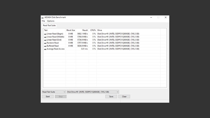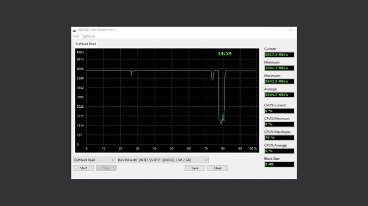 AIDA64 Disk Benchmark 的測試中,循序、隨機都維持在 5500~6000MB/s 的速度,反應時間也極快。