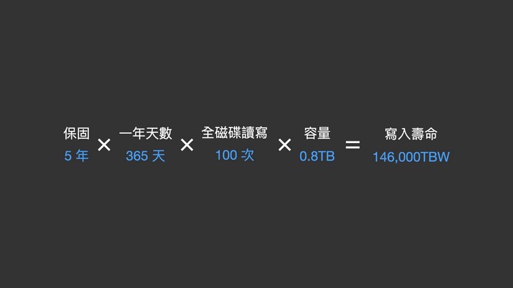 DPWD 是什麼意思呢?就是說在保固期限內,每天可以全磁碟寫入的次數。例如 P5800X 800GB 保固五年,就是 5 年乘 365 天乘 100 次乘 0.8TB,就是 146,000TBW,也就是上面換算 TBW 的方式。