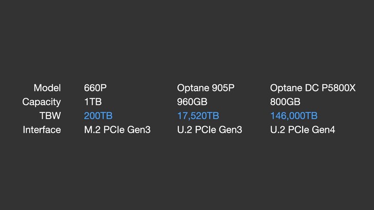 那可能你會想說:「啊這樣不公平啦~拿 QLC 去跟 3D XPoint 比,還拿家用低階跟企業高階來比。」的確是不公平啦~但是這樣一般大眾比較有個比較的基準。就像 SSD 跟 HDD 直接比較,當然也不公平,但起碼知道差距。而且就算拿 P5800X 跟其他品牌的企業級固態硬碟來比較,在寫入壽命這個指標依舊是相當恐怖。