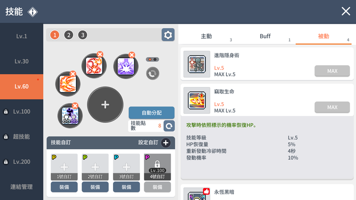 有高傷害的技能外,還有隱身術跟竊取生命,有了這些被動的技能就可以維持基本的傷害與自保,60級以前被動技能先點滿會更快升級!