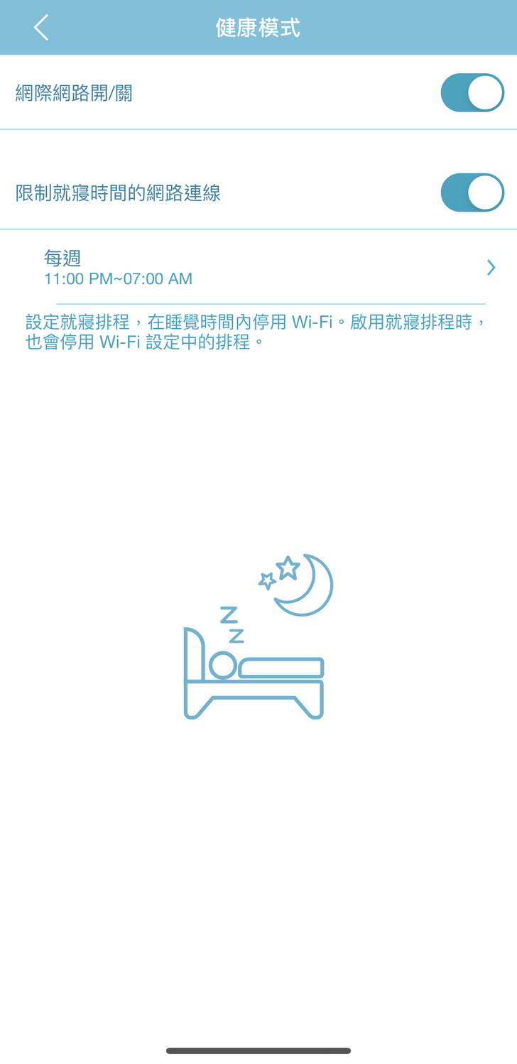 ▼健康模式下可管理將就寢時間的網路中斷 養成睡前不過度上網的好習慣