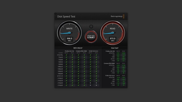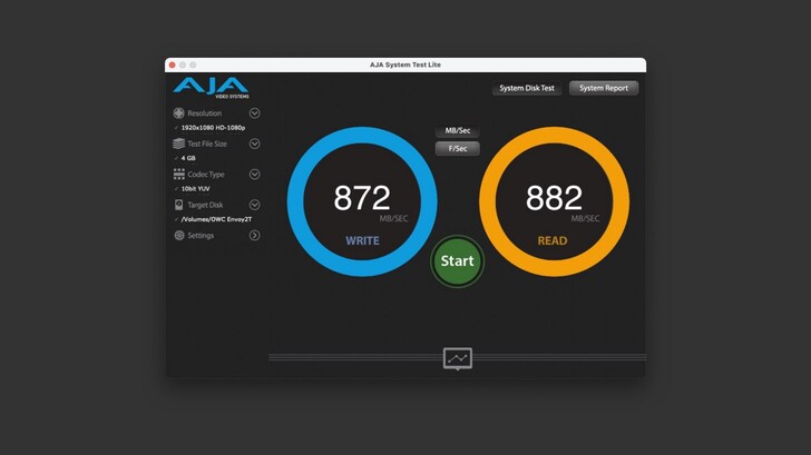 在 Mac 以 AJA 的測速,讀寫也都在 850~900MB/s 之間。