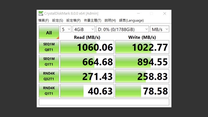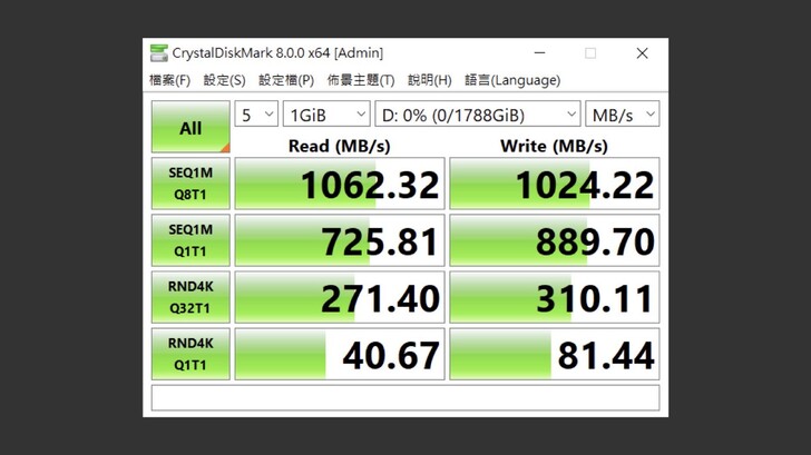 在 Windows 中以 CrystalDiskMark 測試 1GiB,讀寫皆超過 1,000MB/s,也超過官方包裝宣傳的 1011MB/s。