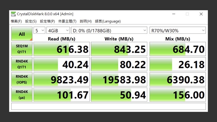 在 Windows 中以 CrystalDiskMark 測試 70/30 的混合讀寫,也有 684MB/s,表現不錯。