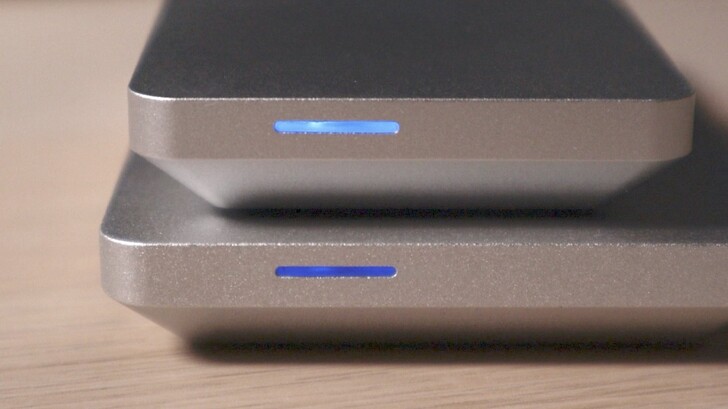 還有超美指示燈,這要特別說一下。市面上平價的 SSD 外接盒,有的是在殼上開個孔讓板子上的 LED 直接透過去,所以當眼睛直視到的時候會覺得那個點很亮。而 OWC 近年的外接盒都是長條形的燈條,裡面是藉由透明塑膠把光源打散,因此燈光非常柔美。