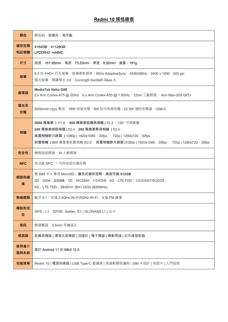 Redmi 10提供卵石白、碳纖灰、海洋藍,機背上的色彩可隨光線折射出動人光澤,呈現可媲美旗艦機款的高質感。即使搭載6.5吋大螢幕及5000mAh(typ)大電量,仍能保有僅181g的輕盈重量及8.92mm纖薄機身,長時間持握也不造成手部負擔。機側指紋解鎖讓用戶單手即可瞬間解鎖;支援NFC技術,讓用戶輕鬆完成所有支付動作。
