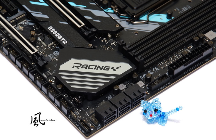 B560晶片組黑銀色散熱片擁有流線外型並搭配RACING標誌RGB燈號。