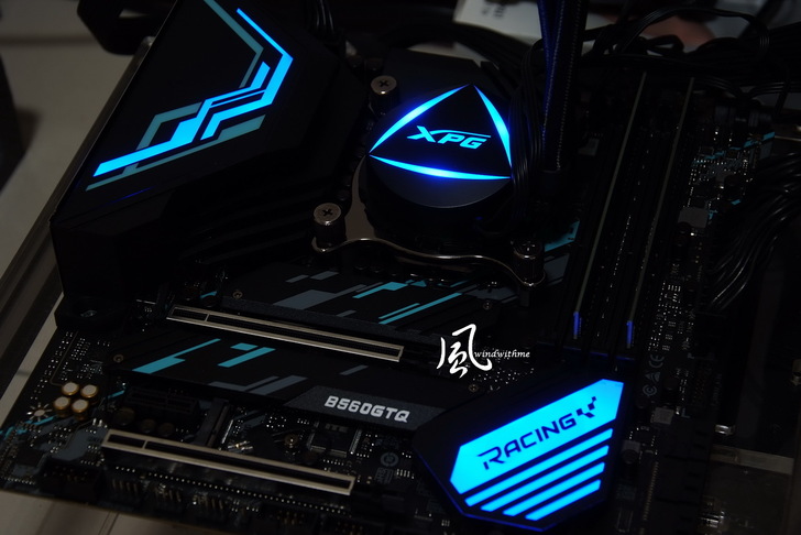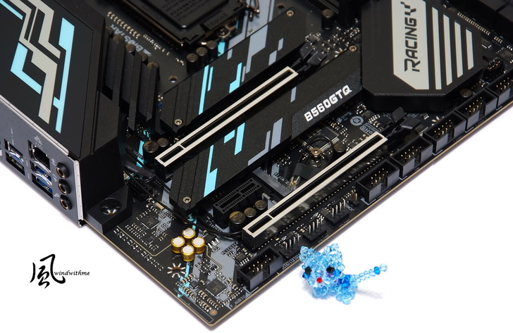 B560GTQ PCB配色以黑色為主,搭配湖水藍線條,銀色鏡面區域為RGB燈號,