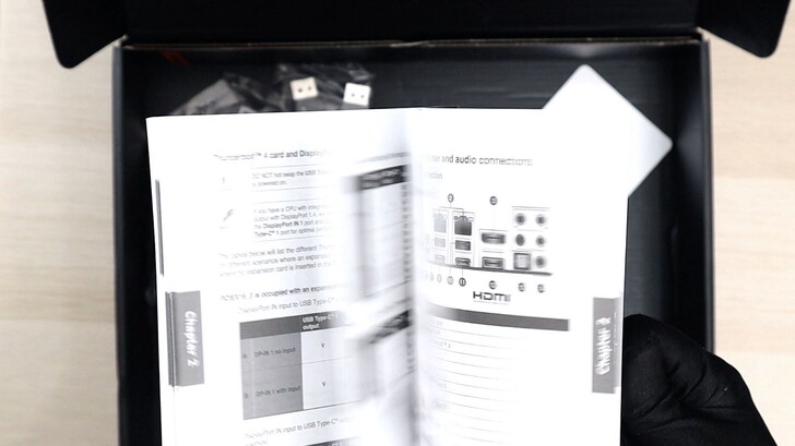 下層有 SATA 線、DisplayPort 短線、英文說明書、驅動光碟、ACC 下載連結……等。其中說明書的封面也相當協調,與產品官網、產品包裝視覺一致。