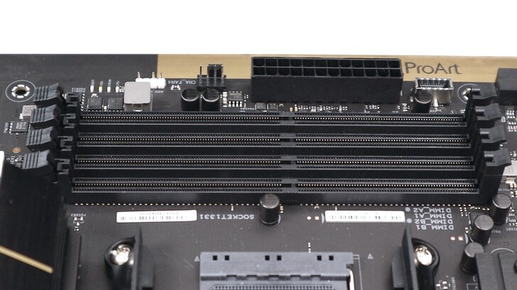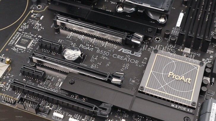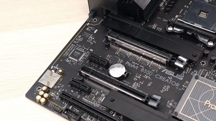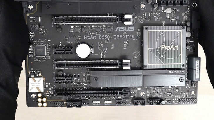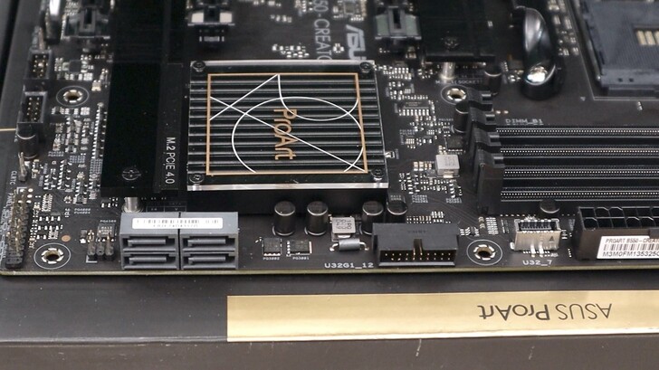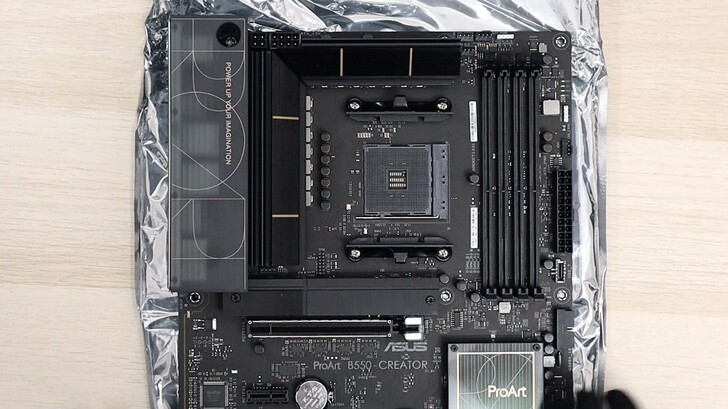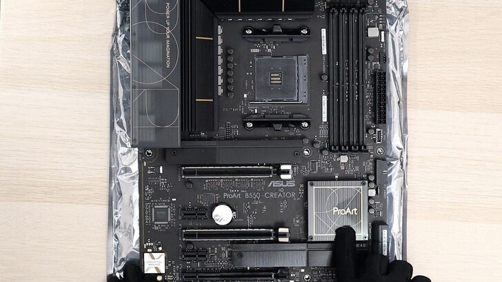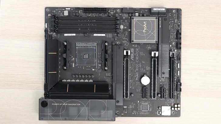 另一個外觀上的特色就是 B550 晶片組的部分,除了以金屬片散熱,表面還有一個透明壓克力板子,上面有 ProArt 的視覺。