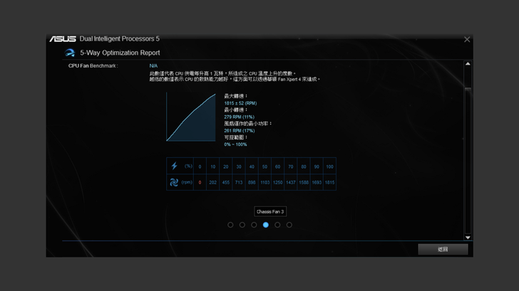 這次也嘗試用了一下 ASUS 內建的管理程式,尤其是控制燈光效果和調整風扇。其中風扇控制部分,可以讓主機板偵測風扇轉速來做調整。