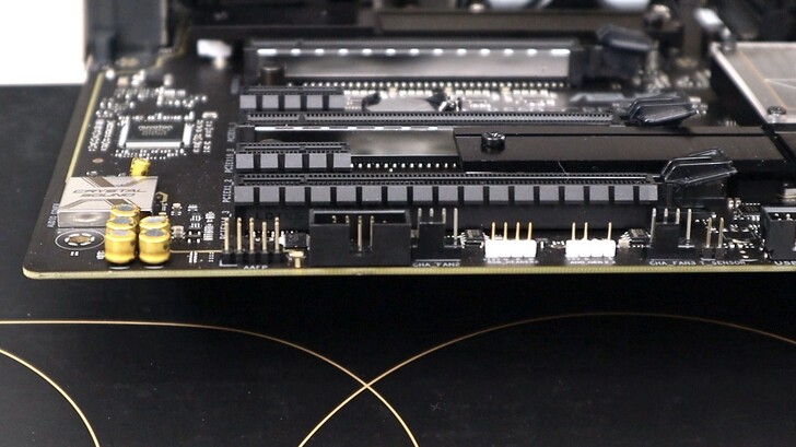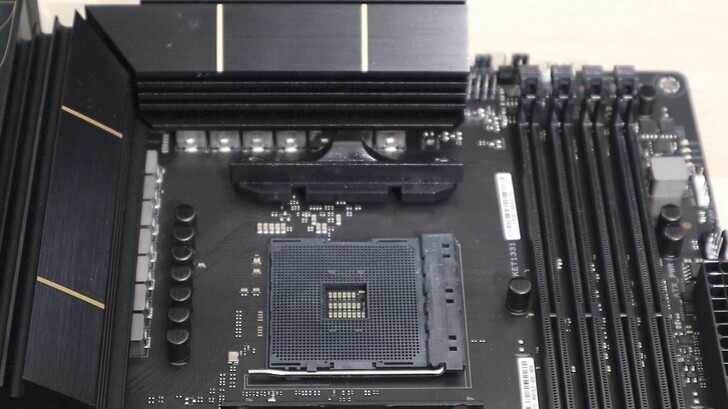 但其實兩塊主要的散熱金屬,只有靠內側有剖溝,靠外側是平面,內部是實心的,因此主機板拿起來沈墊墊的,很有份量感。表面有髮絲紋,加上全黑的設計,讓整體非常莊重。上面還有兩道對稱的金色線條,不過意義有點不明,可能是我悟性不夠高。