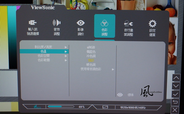 其中色溫提供sRGB、偏藍色、冷色調、預設、暖色調,使用者自訂色調。