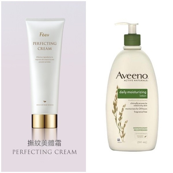 左:法緻撫紋美體霜、右:AVEENO艾惟諾滋養乳液