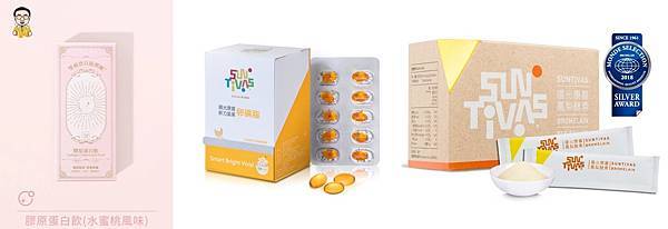 左至右:TKLAB雙嬌寶貝超彈嫩膠原蛋白飲、陽光康喜鮮力蛋黃卵磷脂、鳳梨酵素