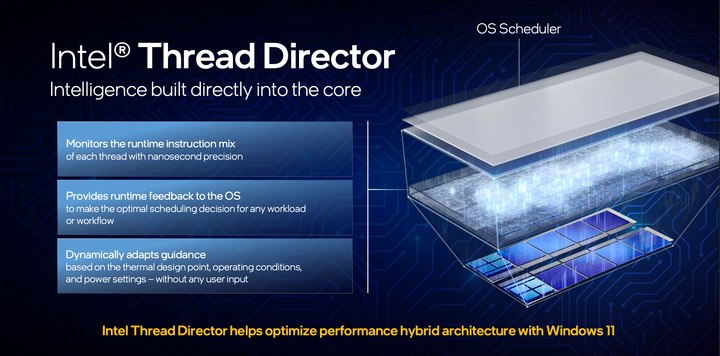 第12代 Intel Core處理器有著Intel Thread Director技術 , 透過引導作業系統 , 讓兩種新核心架構在對的時間將對的執行緒放在正確的核心 , 使新核心微架構能無縫接軌偕同工作 , 並且與Windows 11做了最佳化的調整 , 軟硬體的相互配合 , 創造出最佳工作環境 .