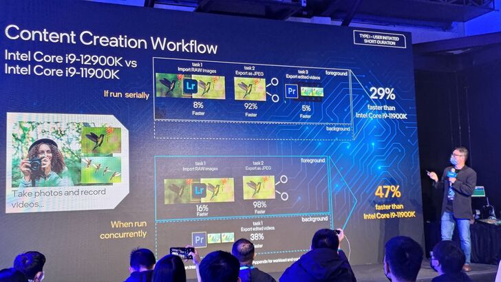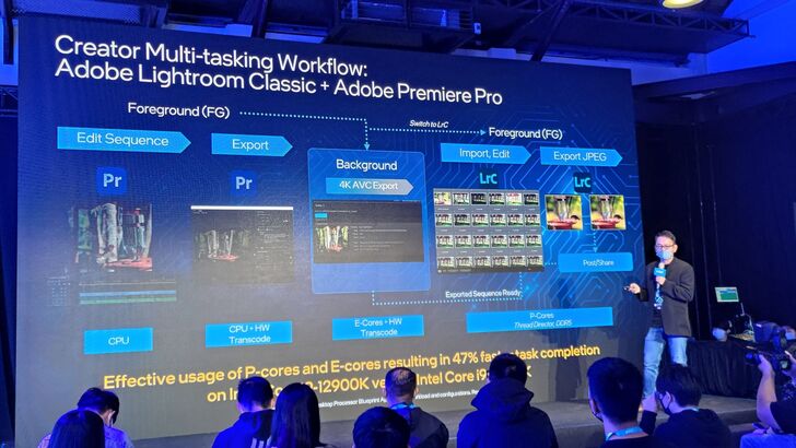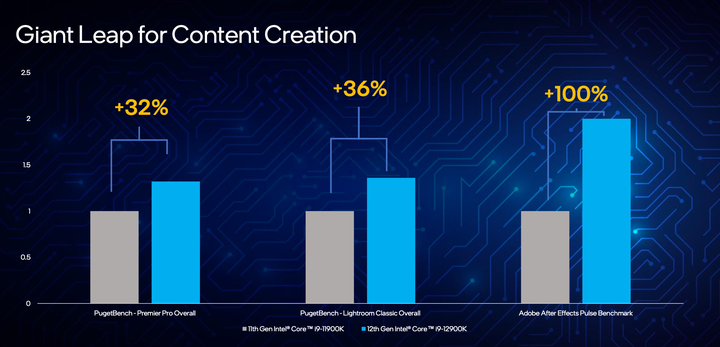 另外在專業創作者效能部分 , 在Adode Premiere Pro、Lightroom Classic、After Effect 軟體中 , i9-12900K對比i9-11900K有32%至100%的領先幅度 .