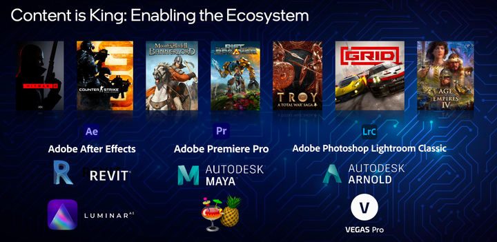 Intel 12th處理器也獲得專業創作者軟體的支援 , 除了Adobe外 , 還包括AutoDesk、VEGAS等專業導向的軟體服務 .