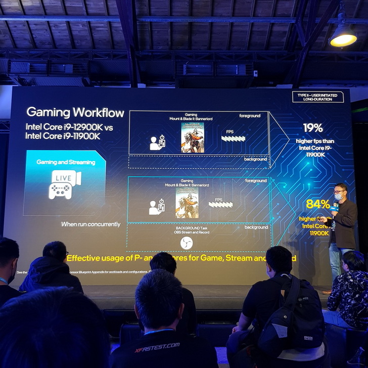 ▼ 遊戲直播主很多都是 一邊玩遊戲一邊線上直播,單純玩遊戲的狀況下,i9-12900K 的效能比 i9-11900K 要多出 19%的Fps 表現,但是在一邊玩遊戲一邊直播的狀況下,i9-12900K 處理器可以提升多達 84%的Fps 表現。