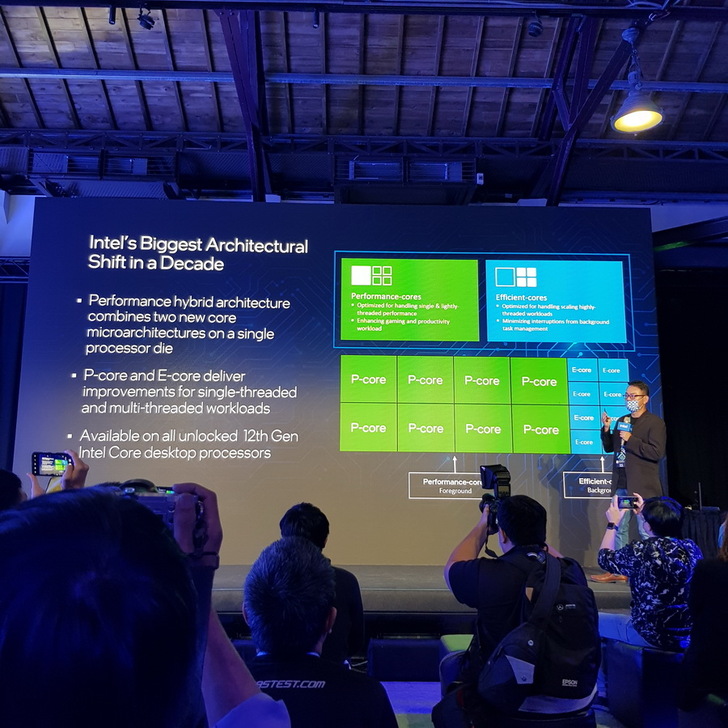 ▼ Intel 這次 Alder Lake架構 最大變革,改採用 性能核 P-Core 跟 效能核 E-Core 兩種核心組合心搭配。